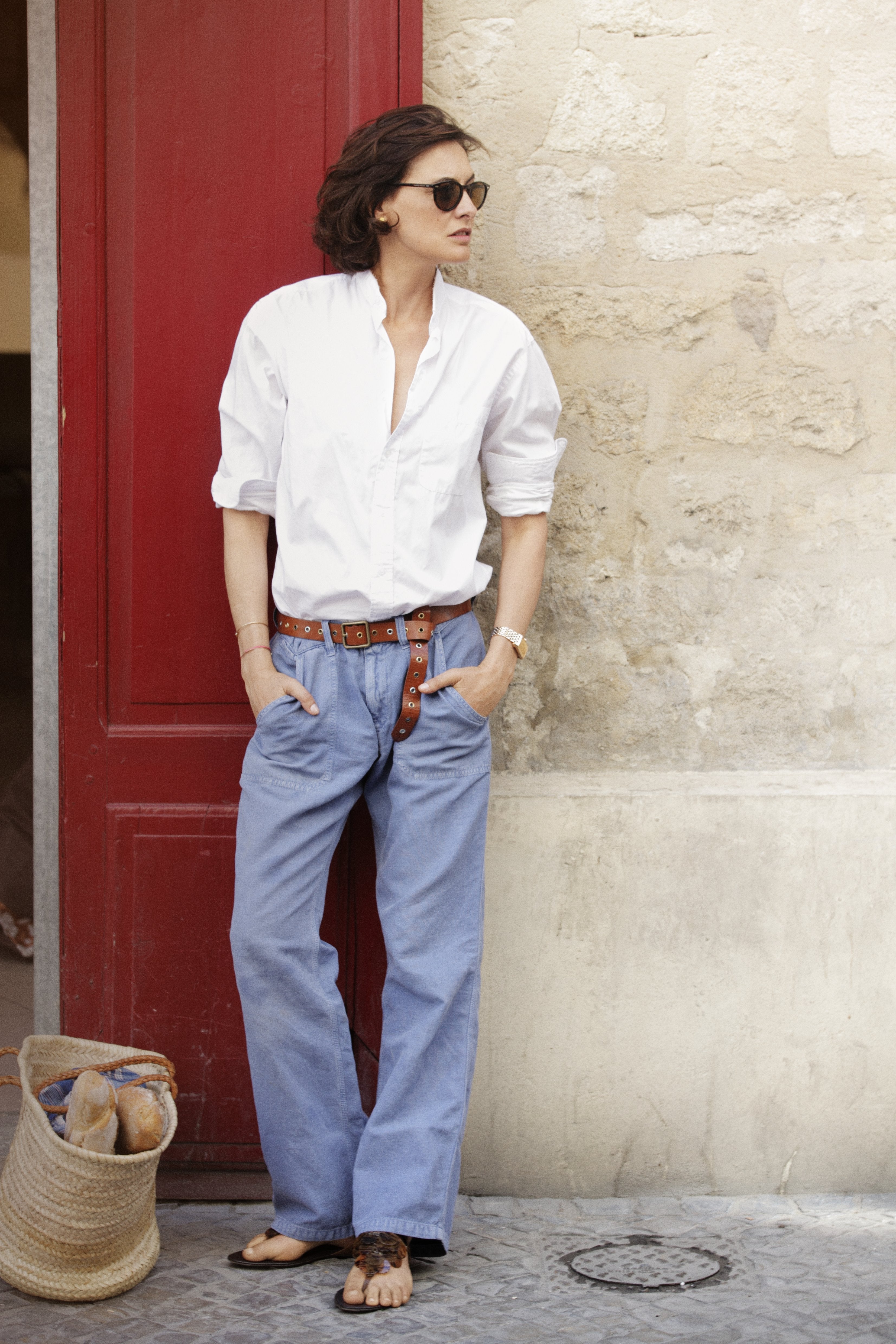 Un bolso que cuesta más que todo el conjunto junto! (risas) Un vaquero blanco, un jersey azul marino y bonitos accesorios. Ropa tomada de los hombres que se vuelve muy femenina. Una simplicidad un poco estudiada. Ropa nueva que parece atemporal. Ropa lujosa pero no ostentosa.